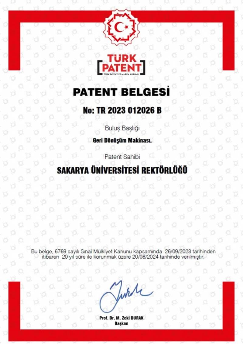 “GERİ DÖNÜŞÜM MAKİNASI” başlıklı ve 2023/012026 başvuru numaralı patent