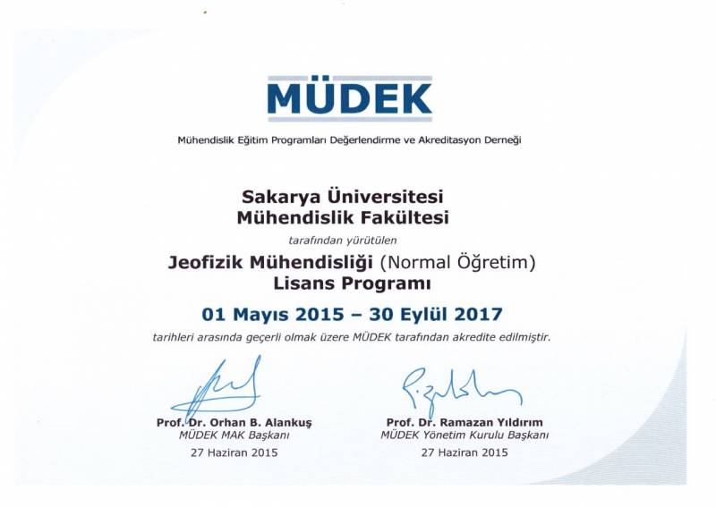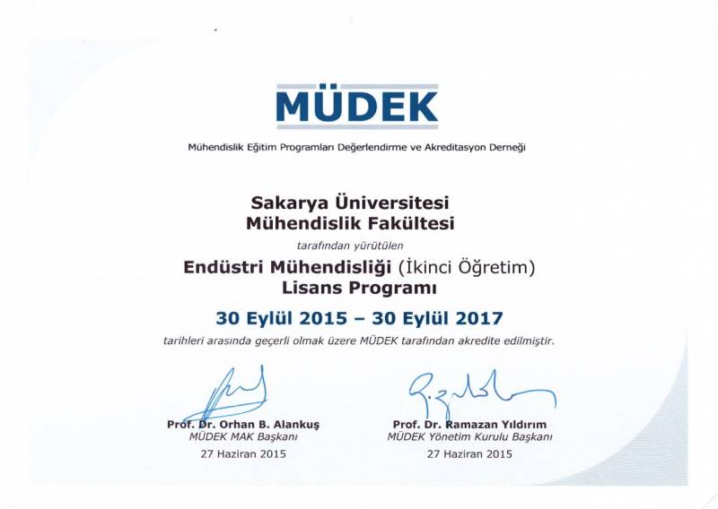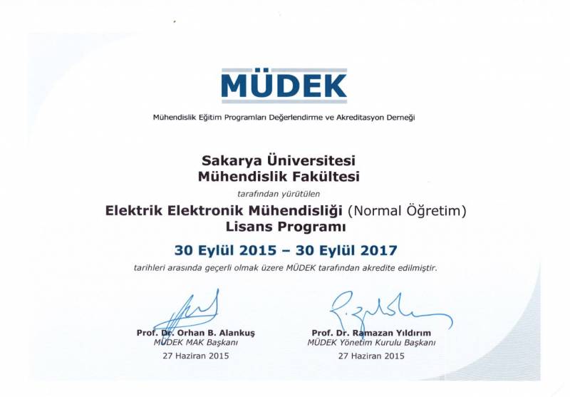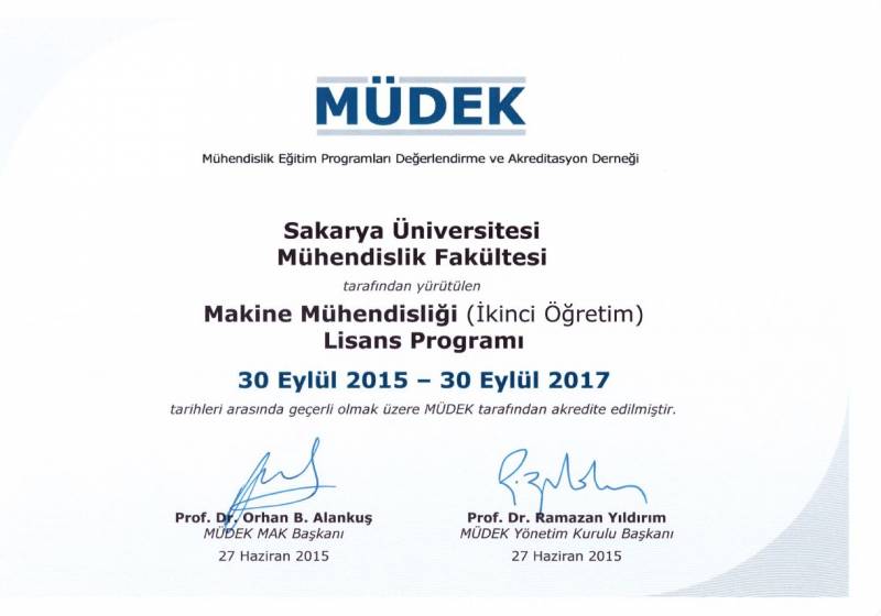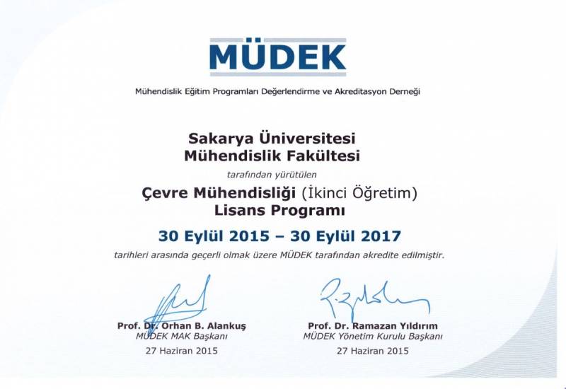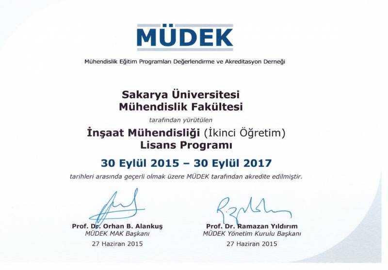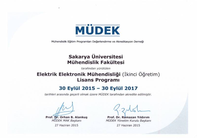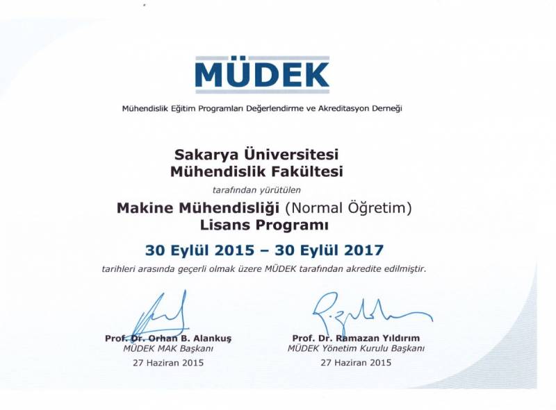 Sakarya Üniversitesi Mühendislik Fakültesinin 2014-2015 değerlendirme döneminde MÜDEK Mühendislik Eğitim Programları Akreditasyon Kurulu (MAK) tarafından değerlendirmesi yapılan;