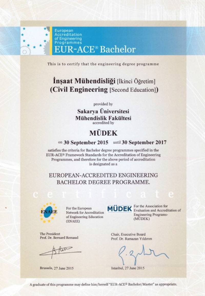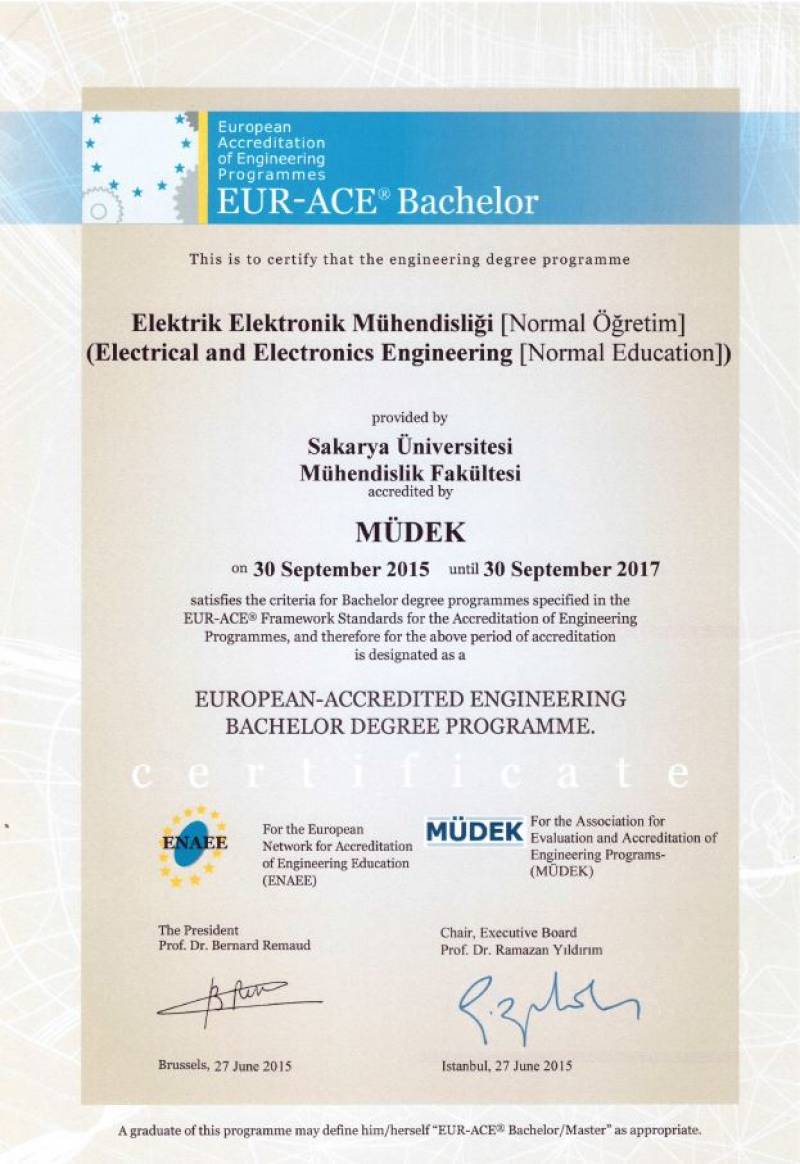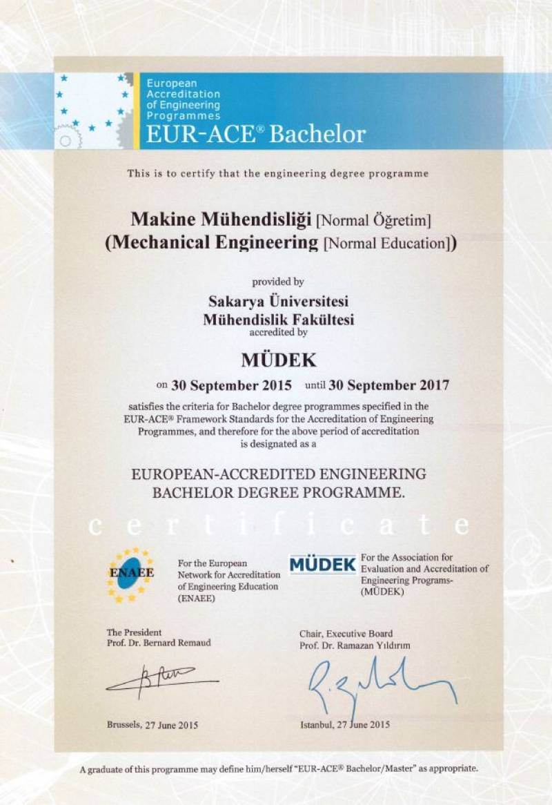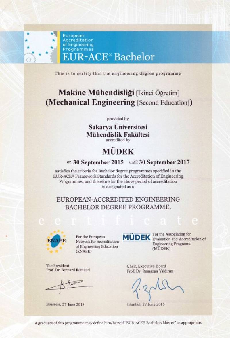 Sakarya Üniversitesi Mühendislik Fakültesinin 2014-2015 değerlendirme döneminde MÜDEK Mühendislik Eğitim Programları Akreditasyon Kurulu (MAK) tarafından değerlendirmesi yapılan;