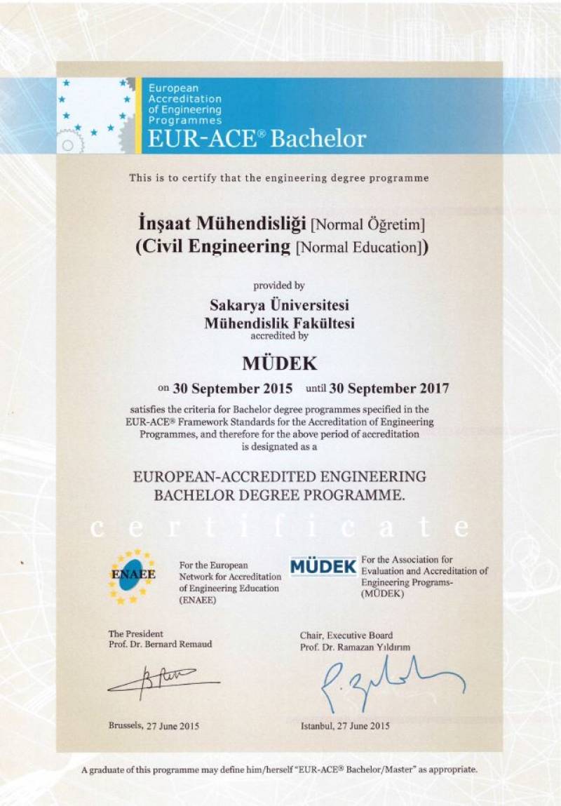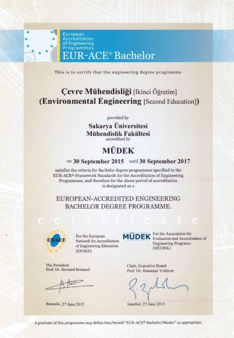 Mühendislik Lisans Programlarına 30 Eylül 2017 tarihine kadar geçerli olmak üzere 2 yıl süreli akreditasyon ve EURACE Etiketi verilmiştir.